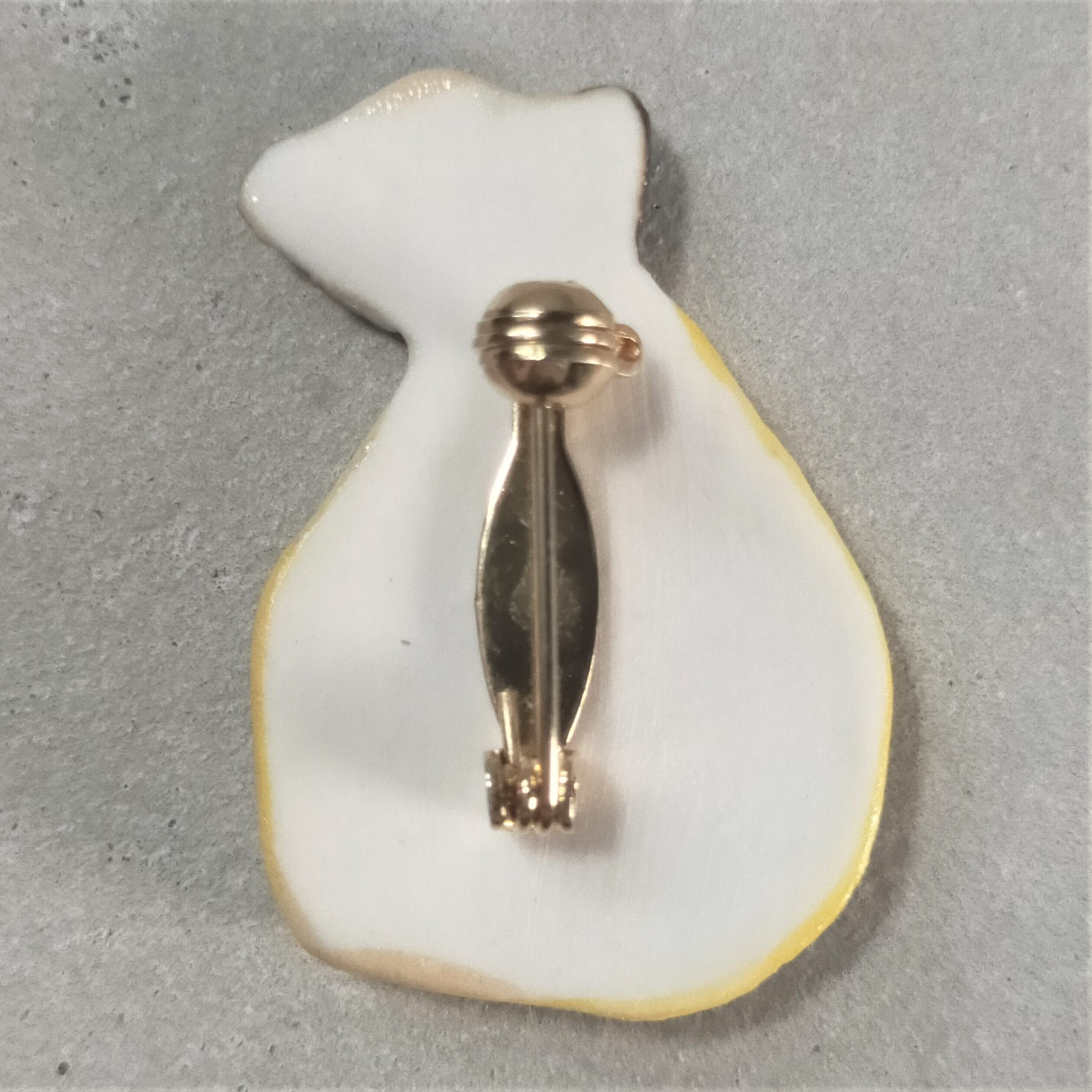 やきもののブローチです。ふるびたアンティーク調の陶器でできたようなし。中の実の部分は枯葉色で貫入が入る釉薬がつかわれていて。光の入る角度によってきらきらと輝いと見えます。種が青色なのがポイント。