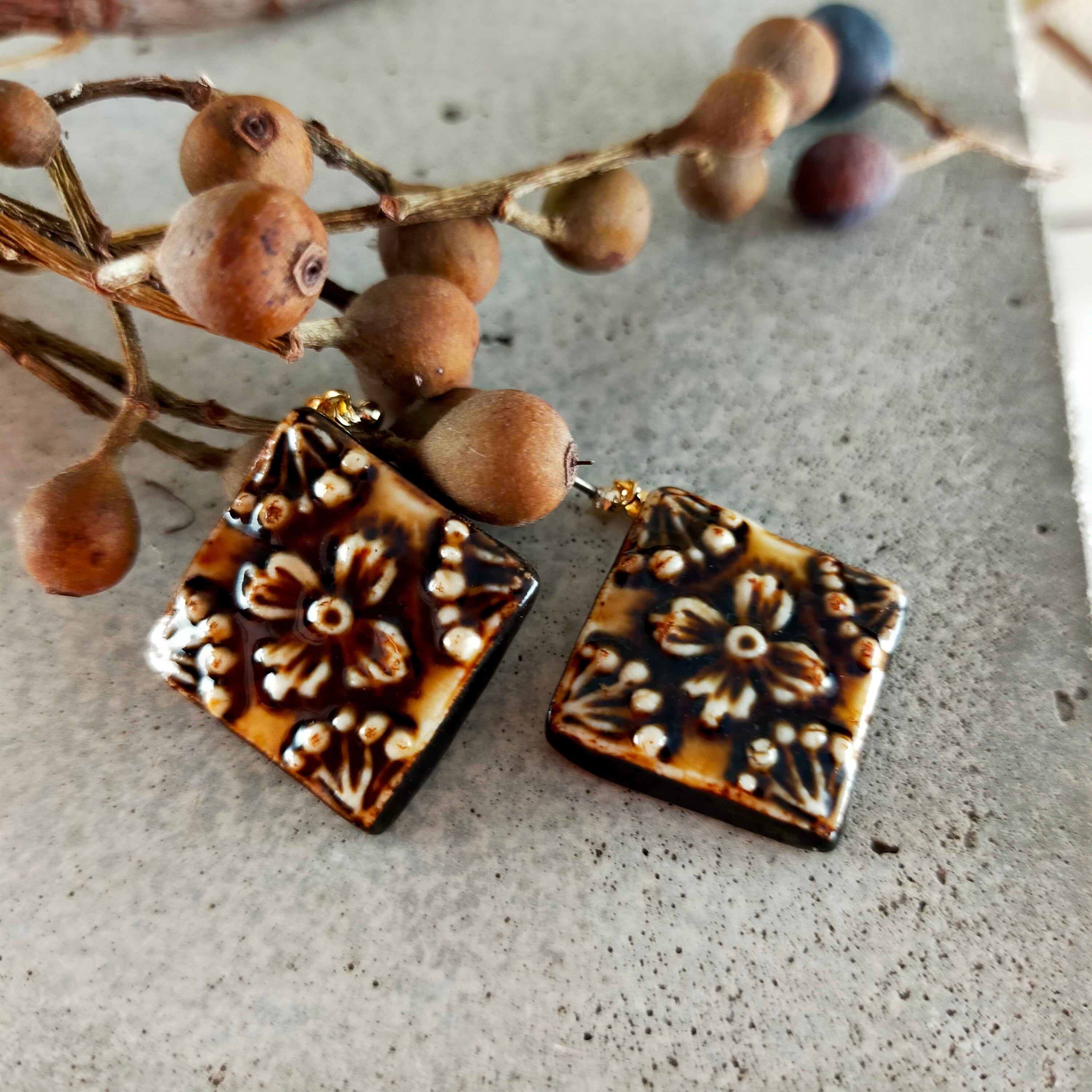 アンティークの西洋のタイルのようなピアスです。古びた琥珀色が美しく、表面に彫り込まれた模様を浮き上がらせています。本物のタイルのように敷き詰めてみると模様が広がるのも隠れたポイントです。
